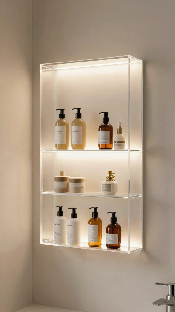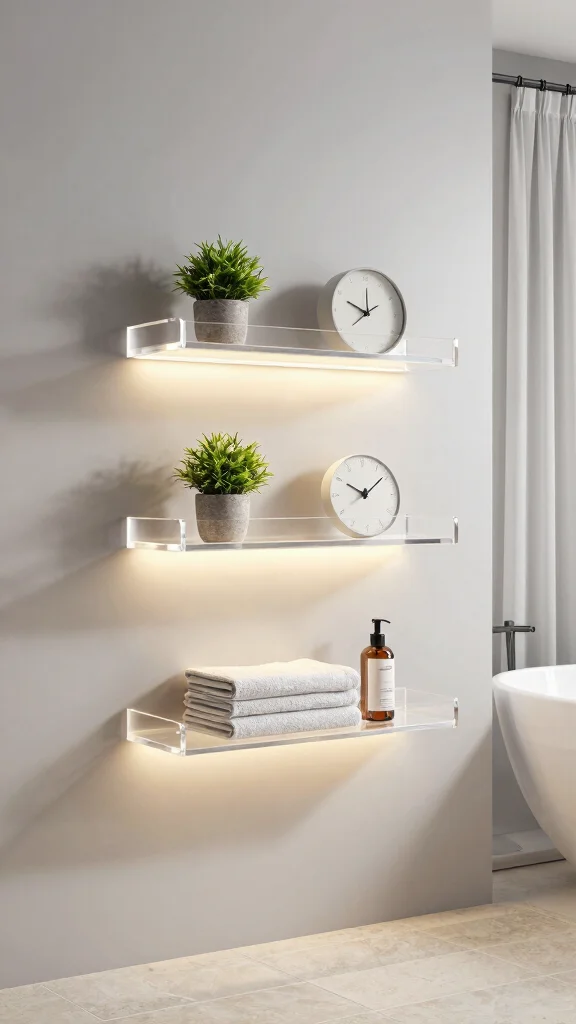 Acrylic shelves with integrated lighting can significantly enhance your bathroom’s ambiance. This smart design choice combines functionality with style, providing illumination where needed while showcasing your favorite decor. Lighted shelves add a contemporary touch to your space, enhancing both aesthetics and usability.
