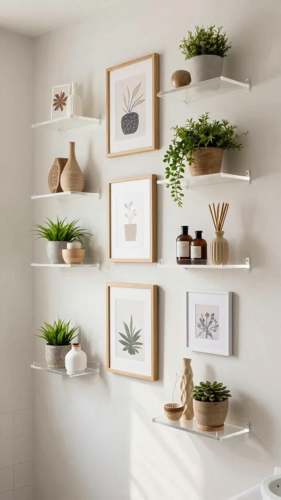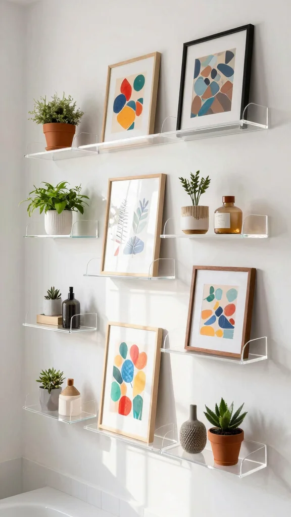 Transform your bathroom decor by turning acrylic shelves into a gallery wall. Arranging multiple shelves together creates a stunning focal point that showcases everything from art to bath products. This innovative idea allows for personalization while keeping a minimalist vibe, making your space truly unique.