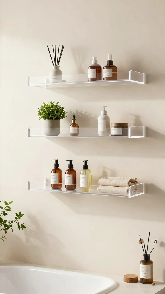 Floating acrylic shelves create a spacious ambiance in your bathroom. Their transparent design provides a sense of openness while offering a stylish storage solution. You can place them above the toilet or near your vanity for quick access to essentials. This clever use of space combines functionality with elegance, making it a perfect choice for modern bathrooms.
