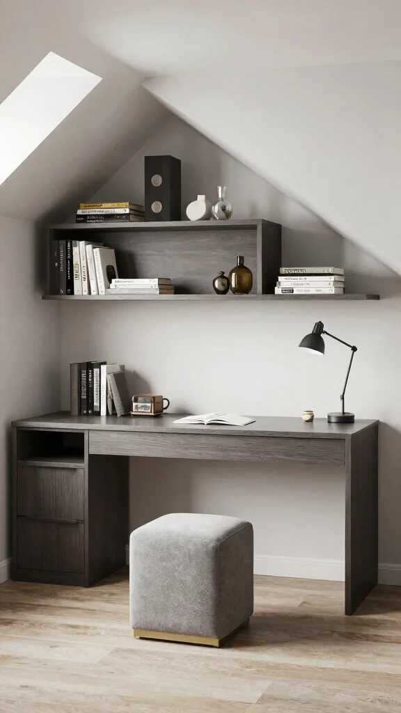 Choose low-profile desks that fit under the slope, like a wall-mounted or L-shaped setup, paired with a compact ergonomic chair to maximize floor space. Use vertical storage along the tall walls to keep the desk area clear, a smart move for small space design and home office decor. Add a mirror or light-reflecting surfaces and good lighting to reduce shadows, a key productivity tip for creative workspace in an attic renovation ideas.