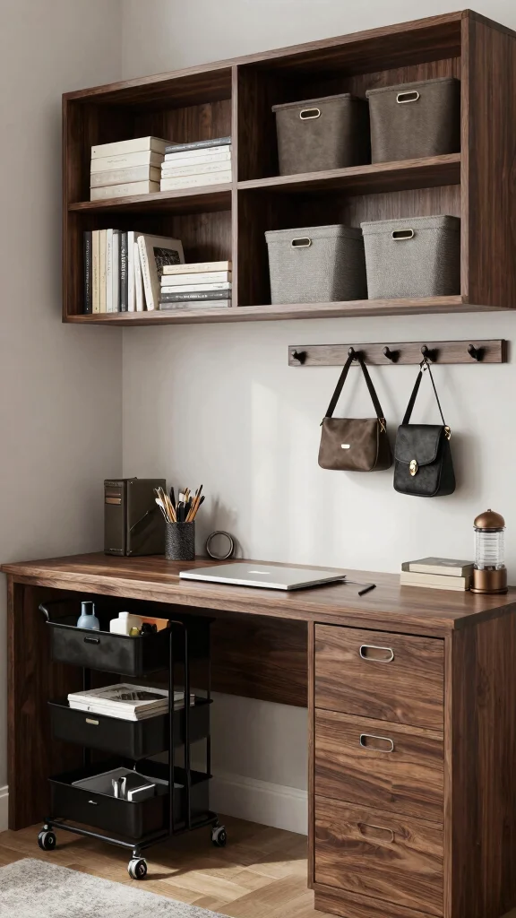 Choosing a minimalist desk design helps maintain a clutter-free environment, while an ergonomic chair ensures comfort during long working hours. Adding a pegboard or wall-mounted shelves nearby allows for easy organization of office supplies, keeping everything within reach and tidy.