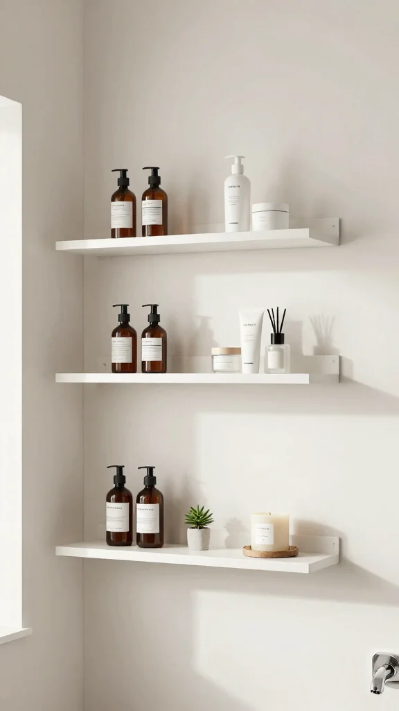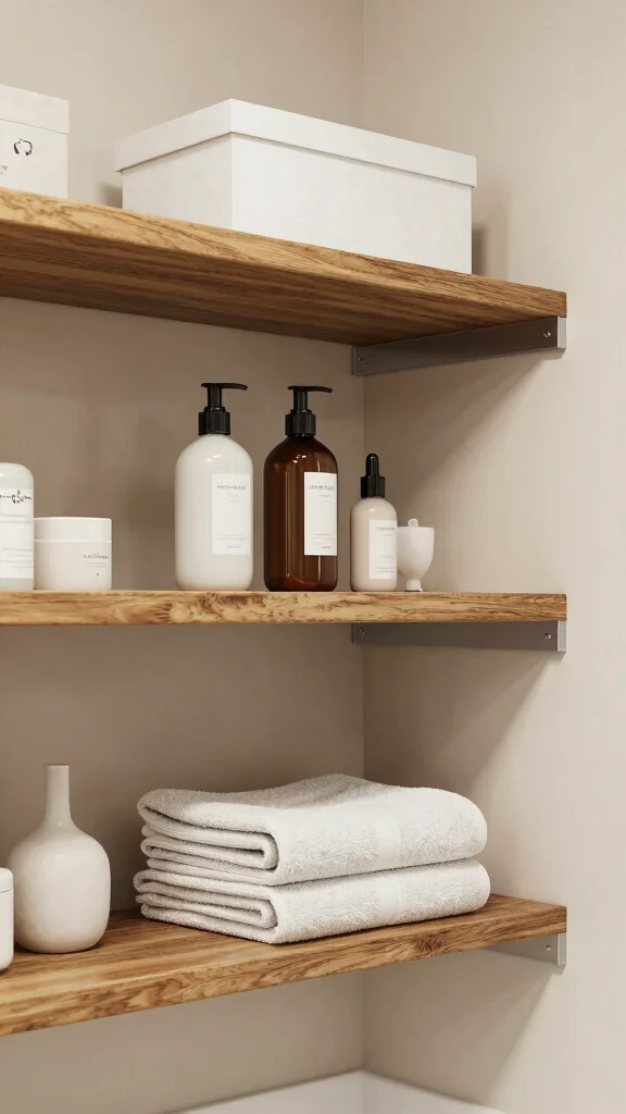 Floating shelves are a modern solution for organizing your bathroom while maintaining an airy feel. Installed at varying heights, these shelves create an open look and allow you to display essentials like skincare products or decorative items without taking up precious floor space. This minimalist style keeps your closet looking clean and inviting.