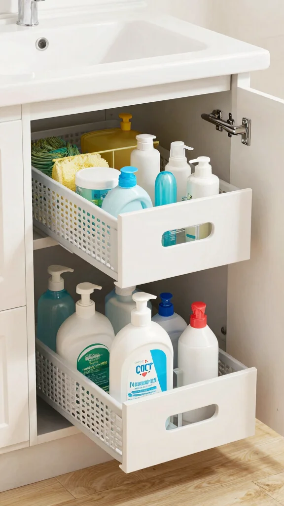 For practicality, consider using a pull-out basket system to make retrieval a breeze. Adding a liner can help prevent spills and simplify cleaning. This solution aligns with the growing trend of maximizing every inch of your bathroom space.