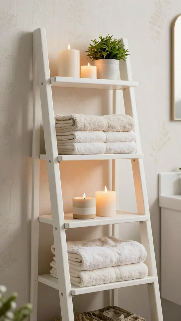 To make the most of ladder shelving, consider using varying heights for your items to create visual interest. A paint color that complements your bathroom’s palette can enhance the overall aesthetic. This trend beautifully combines decor with practicality.