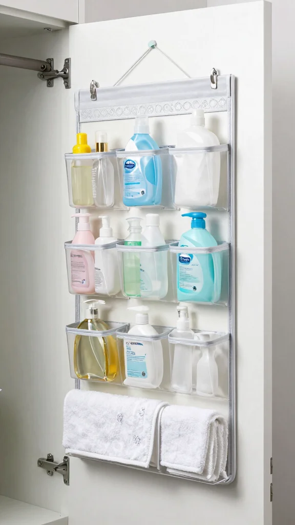 Over-the-door organizers are a smart way to maximize your bathroom closet’s storage potential. These clever solutions utilize the back of your door for storing small items like toiletries and cleaning supplies. With various designs available, from pocket organizers to hanging racks, they cater to different storage needs without requiring installation.