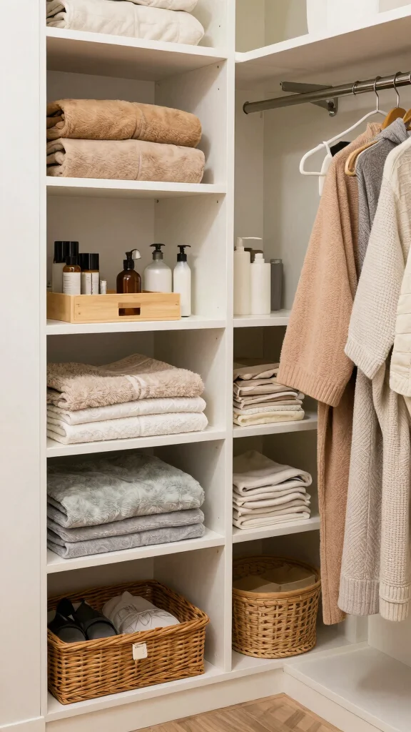 Tiered shelving units are an excellent way to maximize vertical space, transforming your closet into a functional display. These shelves can showcase your favorite bath products or neatly stack towels, turning storage into a stylish statement. Their tiered design allows for easy visibility, so you can quickly find what you need without digging through clutter.