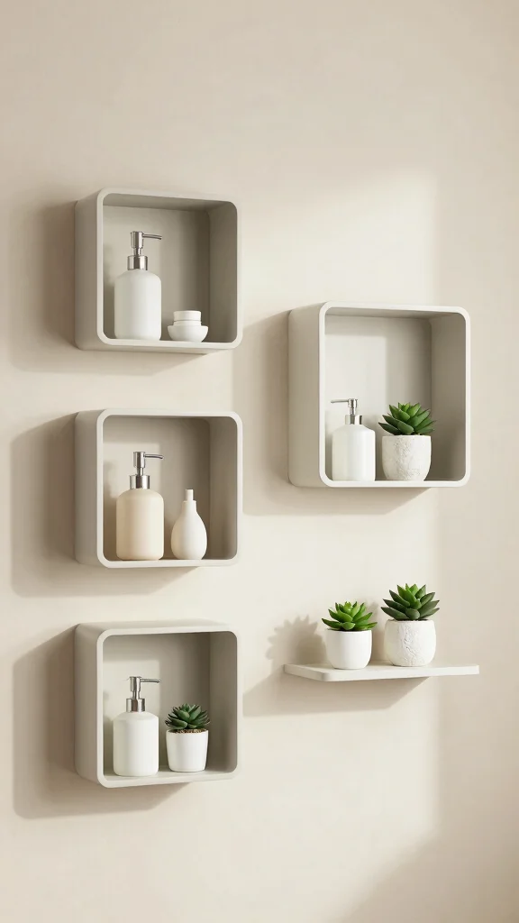 Minimalist floating box shelves can create a clean, modern look in your bathroom. Their various configurations allow for unique wall displays that suit your personal style.