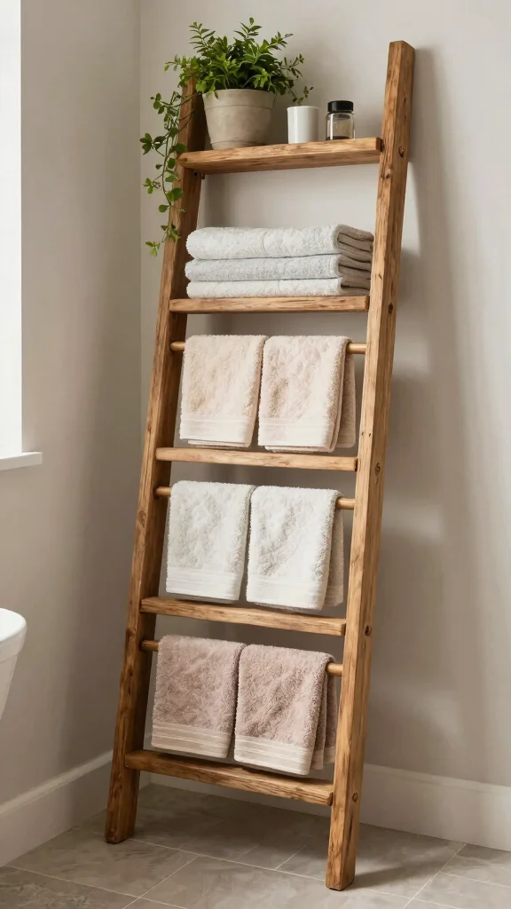 To use ladder shelves effectively, lean them against a wall for a casual look. Utilize the rungs to hang towels, making them both accessible and stylish. Mixing and matching items on each shelf creates a curated feel that adds personality.