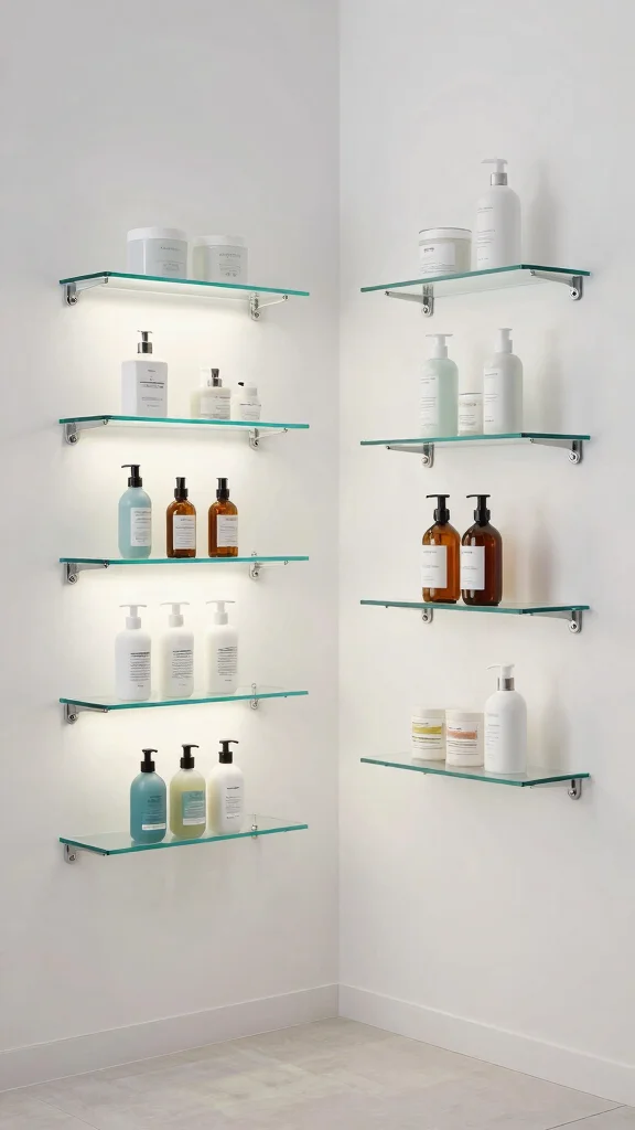 To maximize the benefits of glass shelves, pair them with chrome or brass brackets for a sophisticated look. Use these shelves to showcase luxurious bath products, elevating the overall experience in your bathroom. Their transparent nature helps reflect light, brightening up smaller spaces.