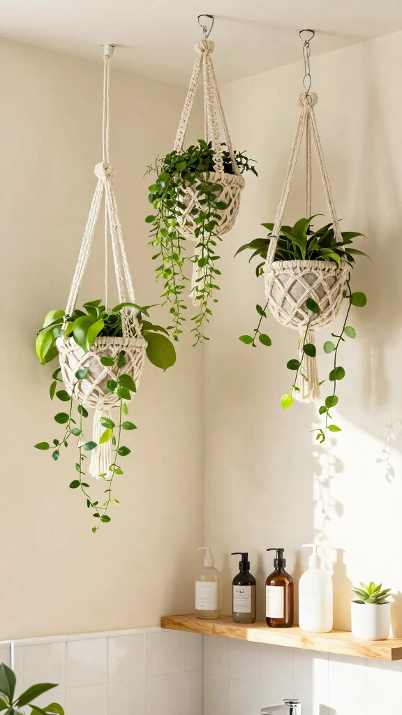 Incorporate hanging planters to bring a fresh, natural element into your bathroom while utilizing vertical space effectively.