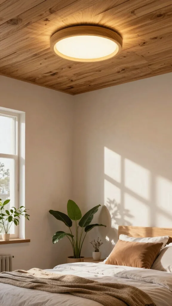 Question: How can I maintain a serene ambiance with sustainable materials for bedroom ceiling lighting design?