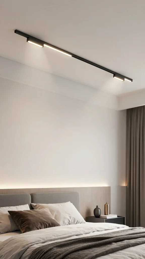 Fun fact: minimalist track lighting can cut energy use by up to 40% with LED heads you can aim precisely where you read. This eco-friendly setup keeps your bedroom lighting ideas ceiling flexible—adjust one fixture to spotlight art or brighten a bedtime nook.