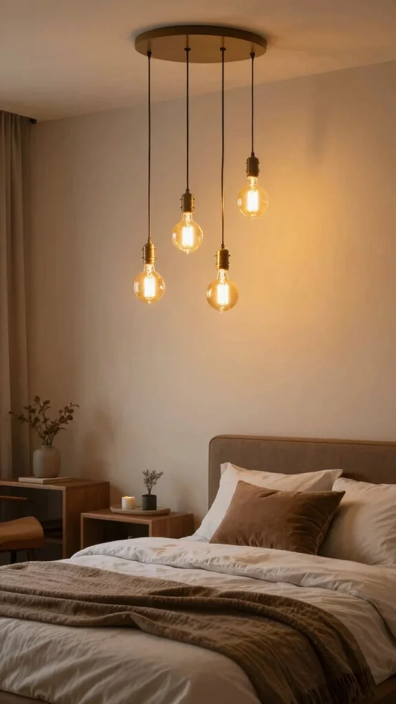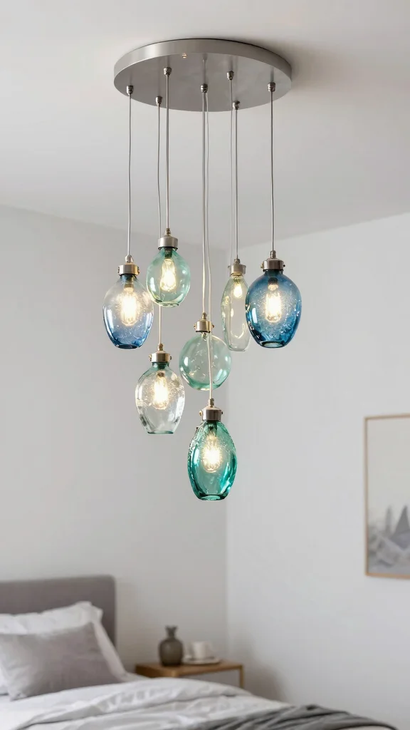 Eco-friendly recycled glass pendants turn bedroom lighting ideas ceiling into a chic, sustainable glow. Cluster a trio above your bed to create a stunning centerpiece that is kinder to the planet as it is elegant. Pro tip: pair warm filament bulbs for a cozy, inviting glow!