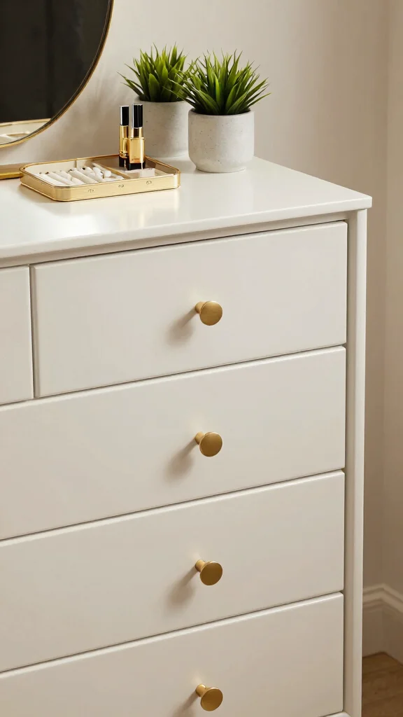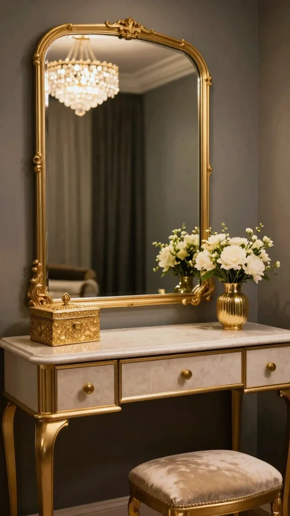 – Choose statement pieces, like a gold-trimmed mirror or decorative box, to serve as focal points.