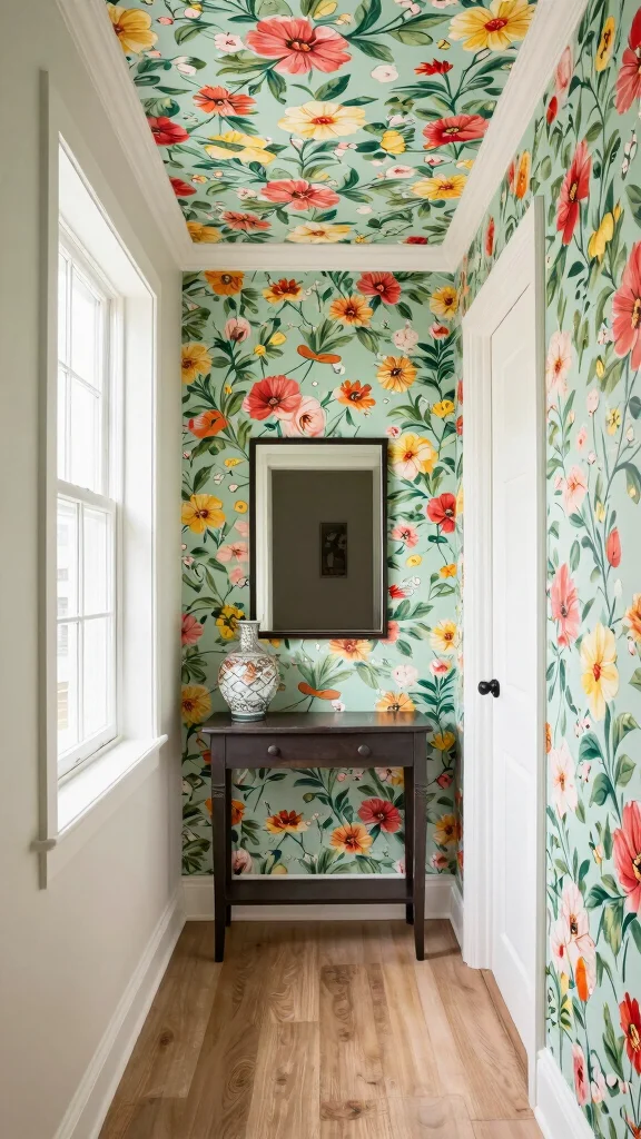 Fun fact: extending wall art to the ceiling is one of the best ceiling border ideas for small spaces. It visually lifts the room by guiding the eye upward with wallpaper, painted stripes, or bold color at the wall-ceiling transition. Try bold contrasts to enhance mood and maximize perceived space.