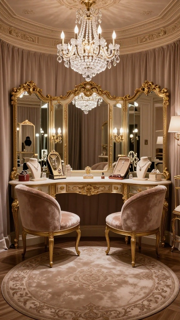 Transform your dressing room into a glamorous retreat inspired by boutique aesthetics, where each moment spent getting dressed feels luxurious. Envision sumptuous fabrics, striking lighting, and elegant antique furniture that create an inviting yet sophisticated atmosphere. A plush area rug adds warmth underfoot, while a stunning chandelier becomes a focal point that captures attention. Incorporating metallic accents like gold or silver through mirrors and drawer pulls enhances this boutique charm beautifully.