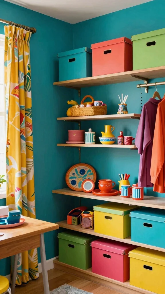 – Incorporate colorful storage options for practicality.
