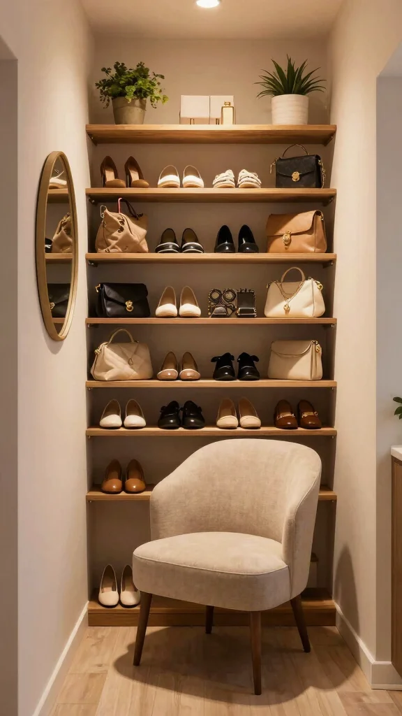 Embracing the corner of your dressing room can create a charming nook that maximizes space. Picture a cozy chair nestled beside a tall shelving unit, offering both style and functionality. This design not only makes the most of an often-overlooked area but also allows for an organized space to store shoes, bags, and accessories, making everything easily accessible and visually pleasing. A mirror on the adjacent wall can enhance the sense of space and brightness, completing this inviting corner.