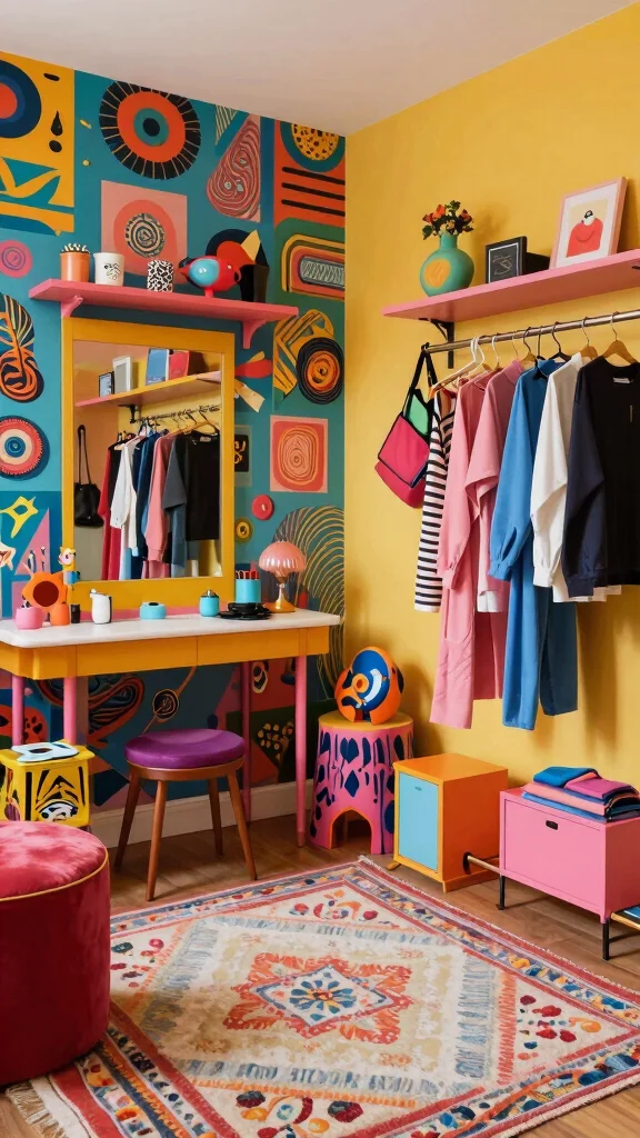 This approach not only keeps your space organized but also adds a vibrant touch to your dressing area. The combination of colors and textures can create a lively atmosphere that feels uniquely yours.