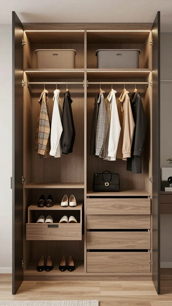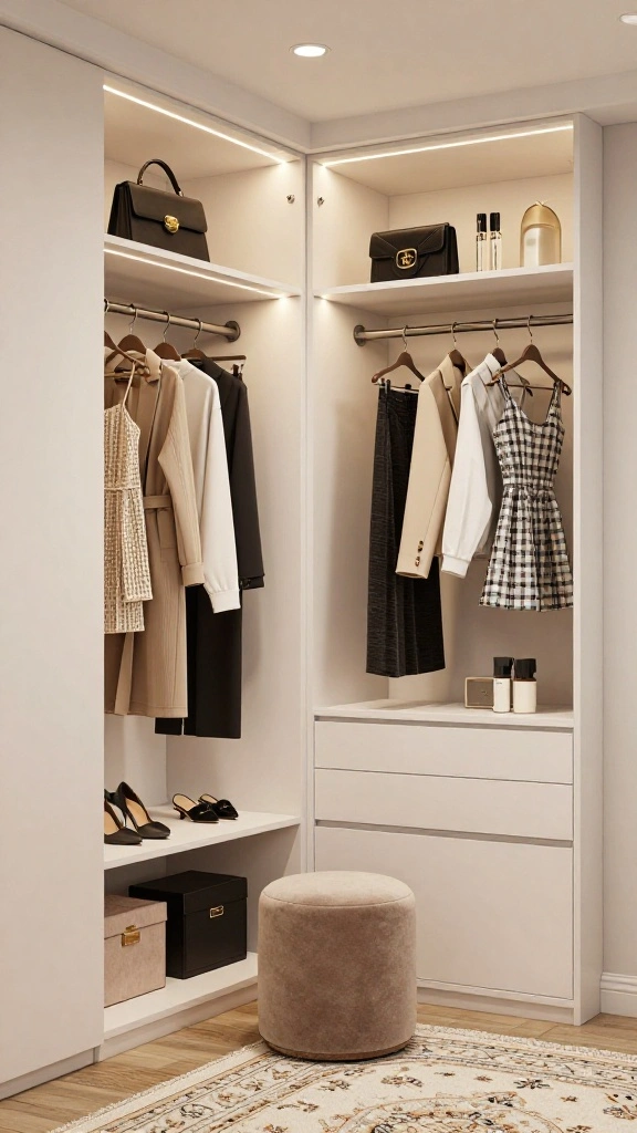 Choose flexible components like adjustable rods, modular drawers, and pull-out baskets to adapt as your wardrobe evolves. If you can, add a slim bench or stool that folds away and a glass-door cabinet to keep items visible without feeling crowded.