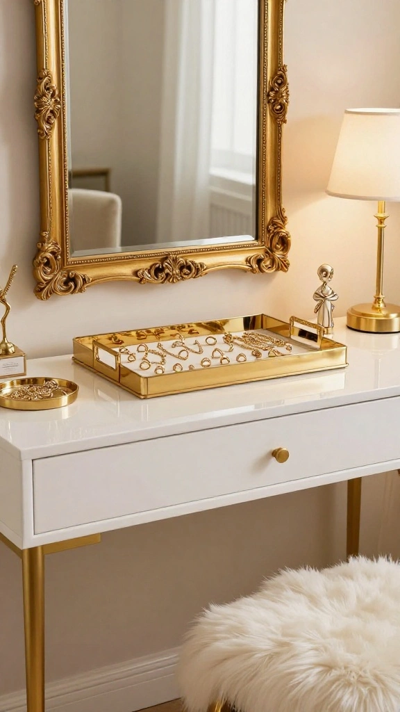 Fun fact: Gold accents can elevate a dressing room table in just 15 minutes of styling, and the glow creates an immediate luxe vibe. A neutral table with gold trays, mirrors, and jewelry organizers showcases your pieces beautifully—and keeps the space glamorous without clutter.