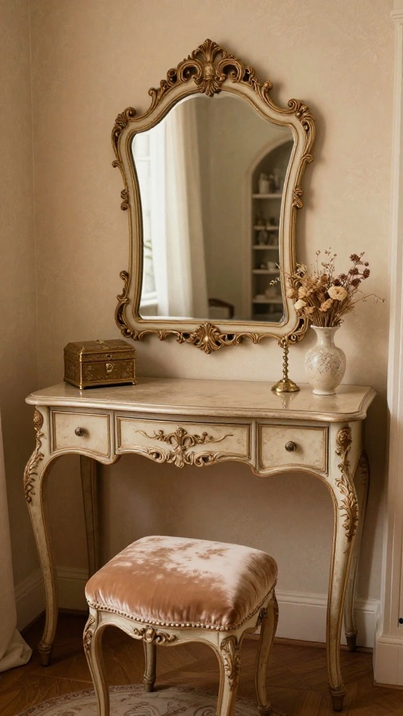 To enhance this vintage look, consider adding a small vintage stool or ottoman that matches your table. A distressed mirror can provide a romantic feel, while displaying cherished jewelry or heirlooms in clear boxes personalizes the space.