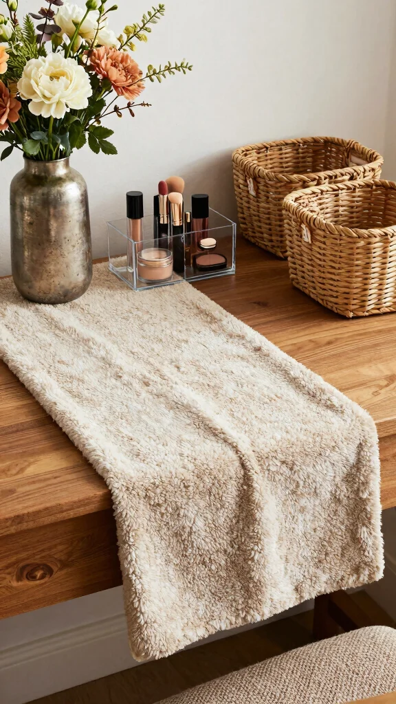 Layering different textures can infuse your dressing room table with depth and visual interest. Mixing materials like wood, metal, glass, and fabric not only makes the setup appealing but also ensures it remains practical. Imagine a wooden table adorned with a plush table runner, accented by metallic decor and glass containers for your makeup essentials.