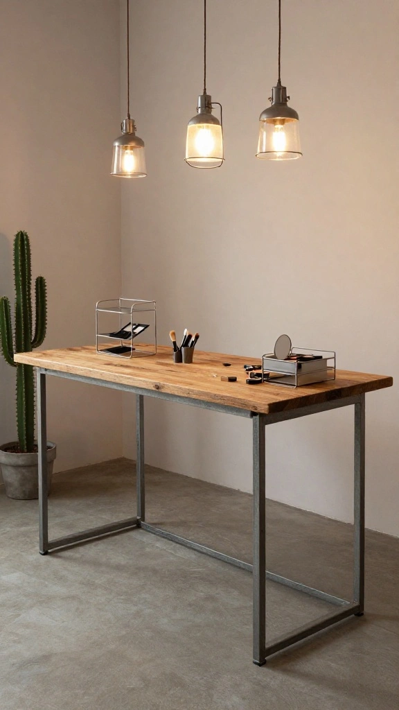 To enhance this aesthetic, integrate industrial-style lighting fixtures that complement the overall look. Utilize metal organizers or trays for makeup and accessories to maintain a cohesive style. Keep the color palette neutral, using black, grey, and white while adding warmth through wooden accents.