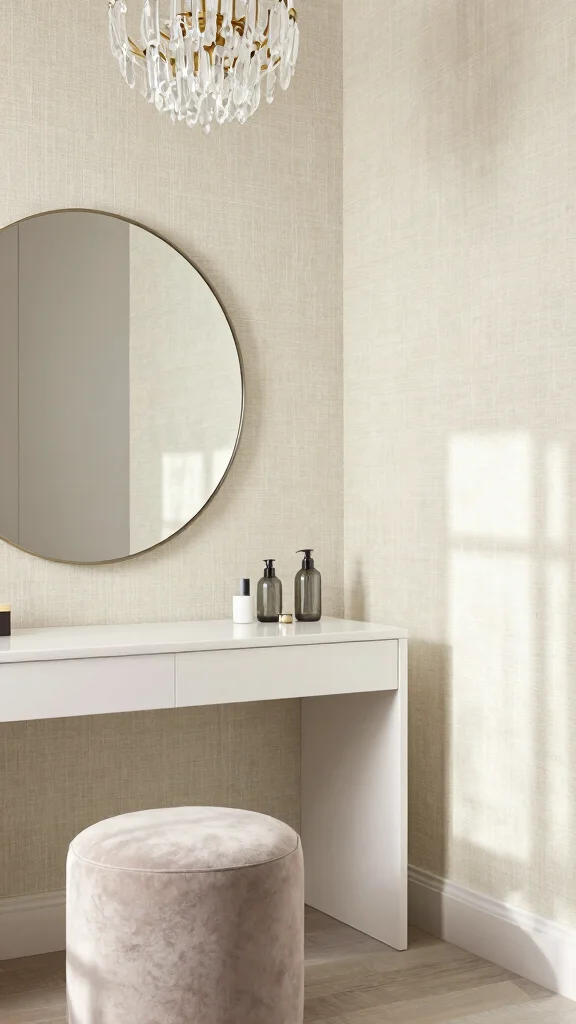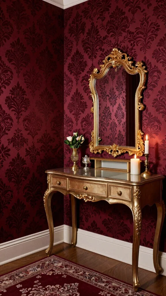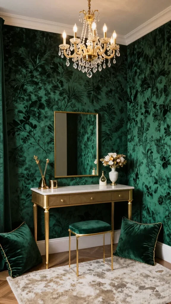 Velvet wallpaper adds a luxurious texture to your dressing room, creating an inviting atmosphere.