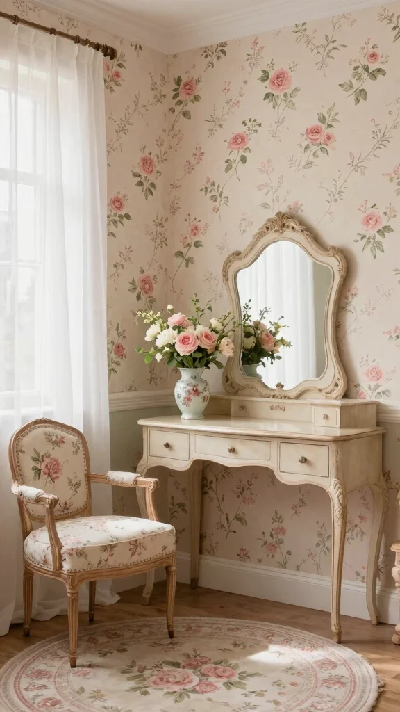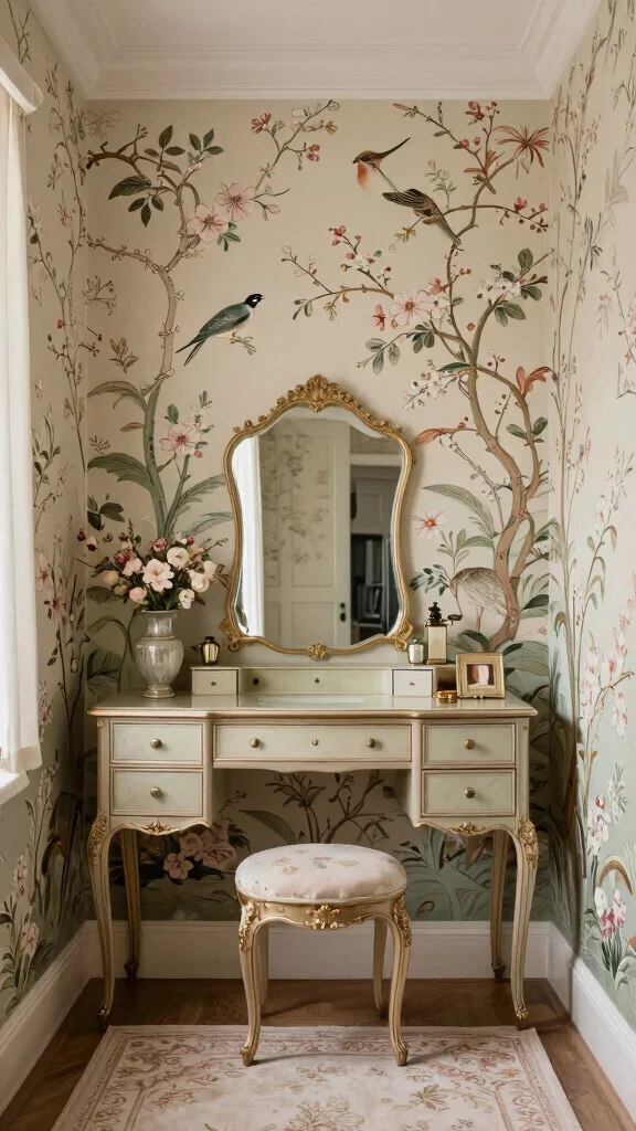 Vintage floral wallpaper brings a charming, nostalgic ambiance to your dressing room.