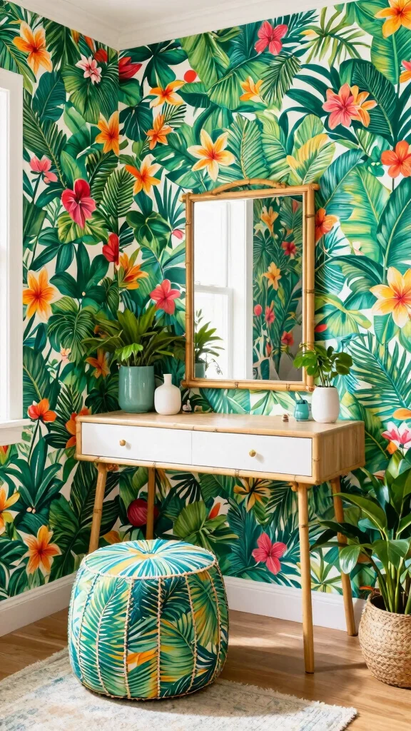 Tropical print wallpapers transform your dressing room into a vibrant escape filled with lush greenery and exotic florals.