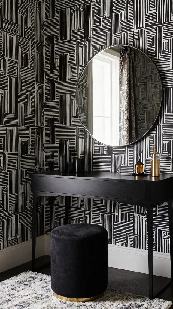 Monochrome wallpaper is an elegant choice that brings striking contrast to your dressing room.
