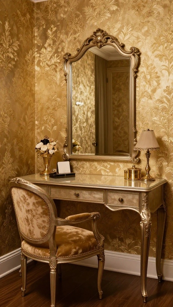 For those who love glamour, metallic wallpaper adds a dazzling effect to your dressing room.