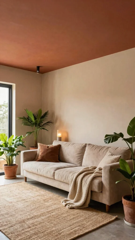 To elevate the natural vibe of an earthy ceiling, consider incorporating wooden beams or decorative accents. Surrounding the space with lush greenery further bridges the indoor and outdoor aesthetic, creating a cohesive and harmonious environment.