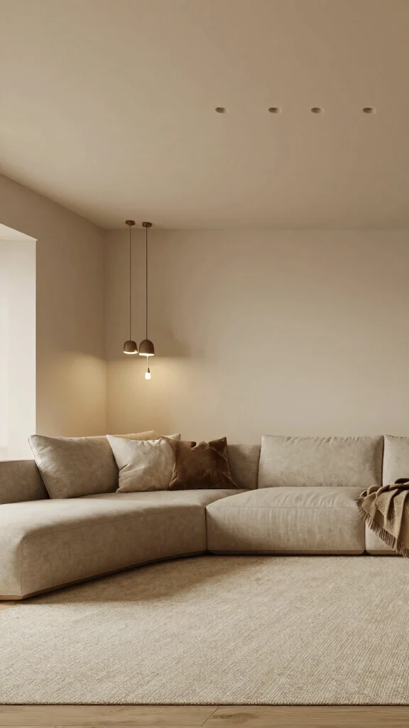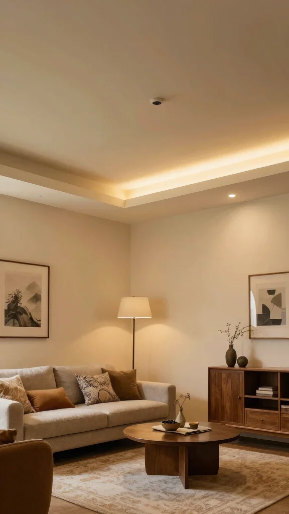 To highlight a light beige ceiling, consider adding wooden beams or decorative moldings. Warm lighting fixtures will enhance the inviting vibe, making the space feel more welcoming for gatherings and relaxation.