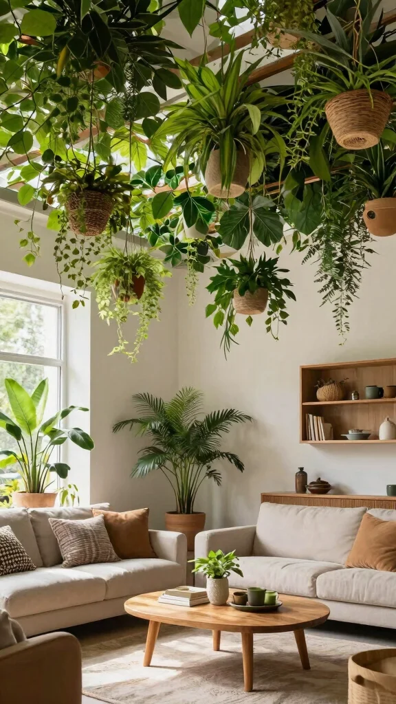 How can I incorporate creative ceiling lighting while staying sustainable in a living room?