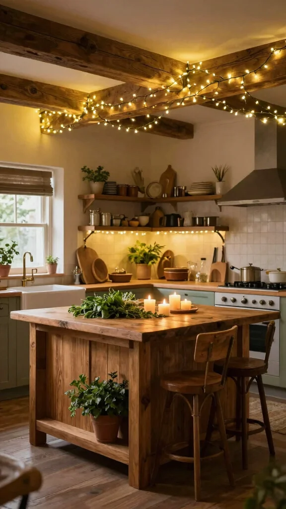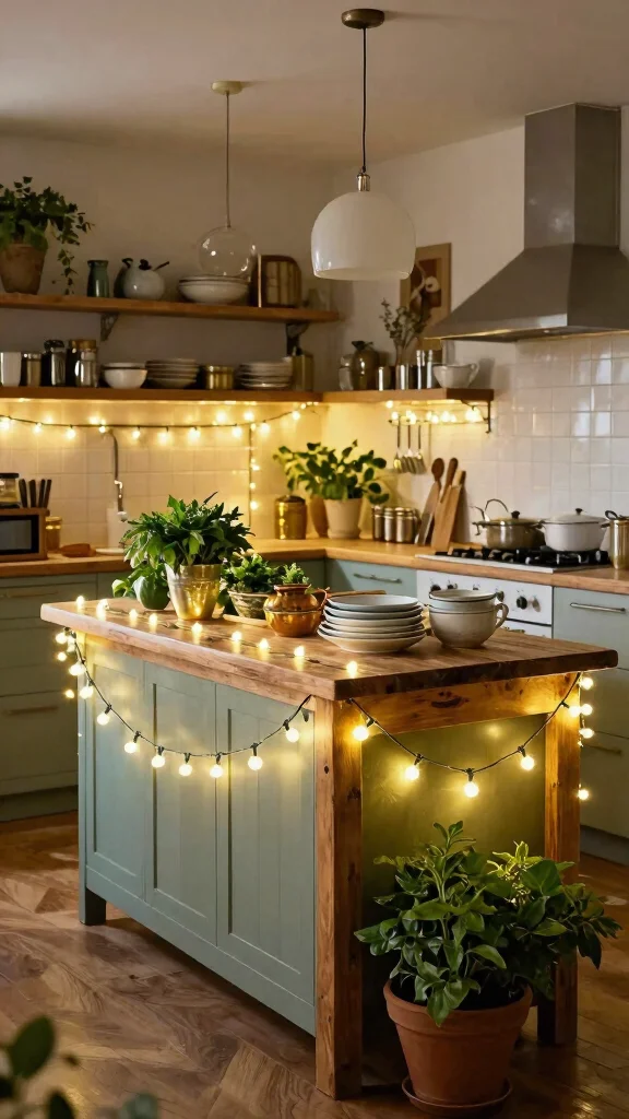 String fairy lights around your kitchen island for a soft glow and whimsical touch, ideal for evening gatherings.