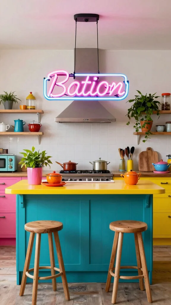 Hanging a neon sign or fixture above your kitchen island serves as both art and light, sparking conversation and joy.