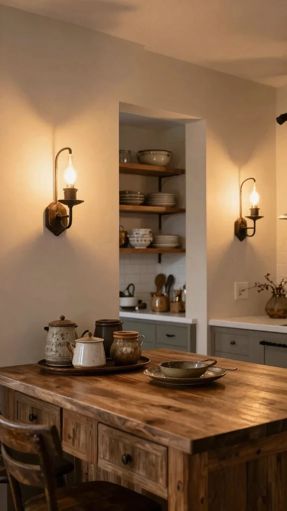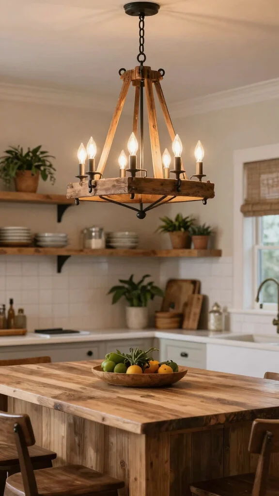 Use candle fixtures for a warm, inviting glow, perfect for enhancing the farmhouse kitchen experience.