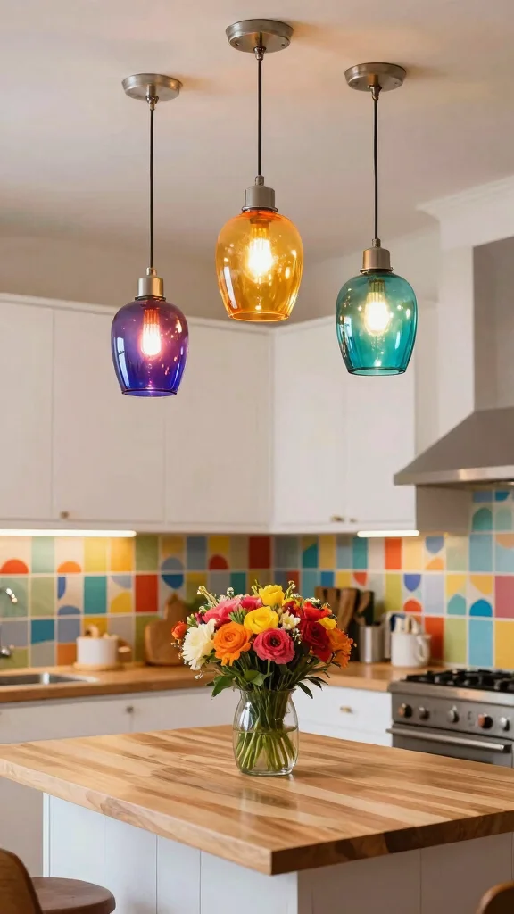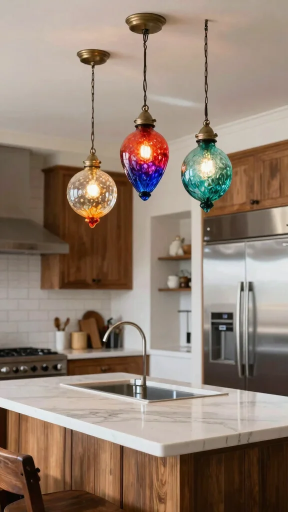 Colorful glass pendants can serve as fun conversation starters, energizing your kitchen and making it a dynamic space.