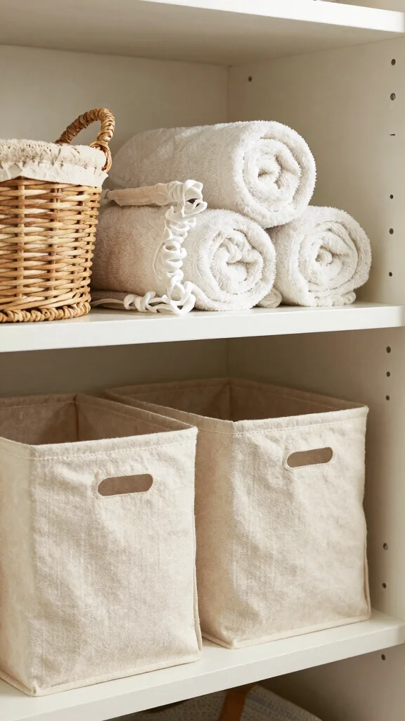 Use decorative storage solutions like slim baskets behind doors or under-shelf bins where possible.