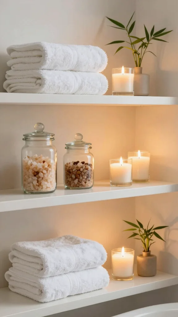 Transform your bathroom shelves into a tranquil spa-like retreat by showcasing relaxation essentials. Picture plush towels, soothing bath products, and scented candles that evoke a serene atmosphere. Clear glass jars filled with bath salts not only keep things organized but also add an elegant touch to your decor.
