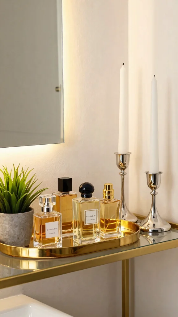 For a glamorous touch, consider using gold trays to organize smaller items like perfumes. Pair metallic candle holders with white candles for an elegant contrast. Balancing these shiny elements with soft textures, such as fluffy towels, ensures a harmonious look.