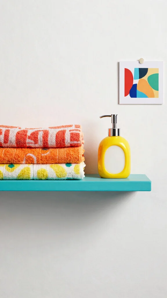 Colorful towels bring a chic pop to bathroom shelves—stack them neatly, either rolled or folded, for an organized display. Mix and match hues to energize a neutral space; a few vibrant tones can transform the shelf into a polished focal point.