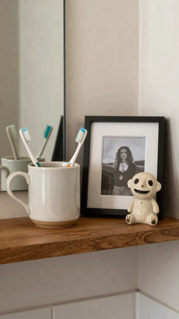 Consider using sentimental items, like a cherished mug as a toothbrush holder. Display framed artwork or photographs that resonate with you. Creating a mini gallery with small art pieces or interesting objects adds character to your shelves.