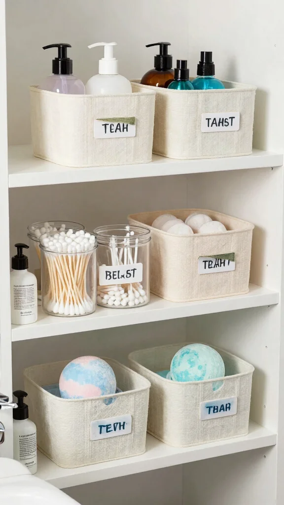 Consider using clear containers for visibility while maintaining a chic appearance. Labeling baskets allows for quick identification of contents, making your routine smoother. Exploring vertical storage options can also optimize limited space effectively.