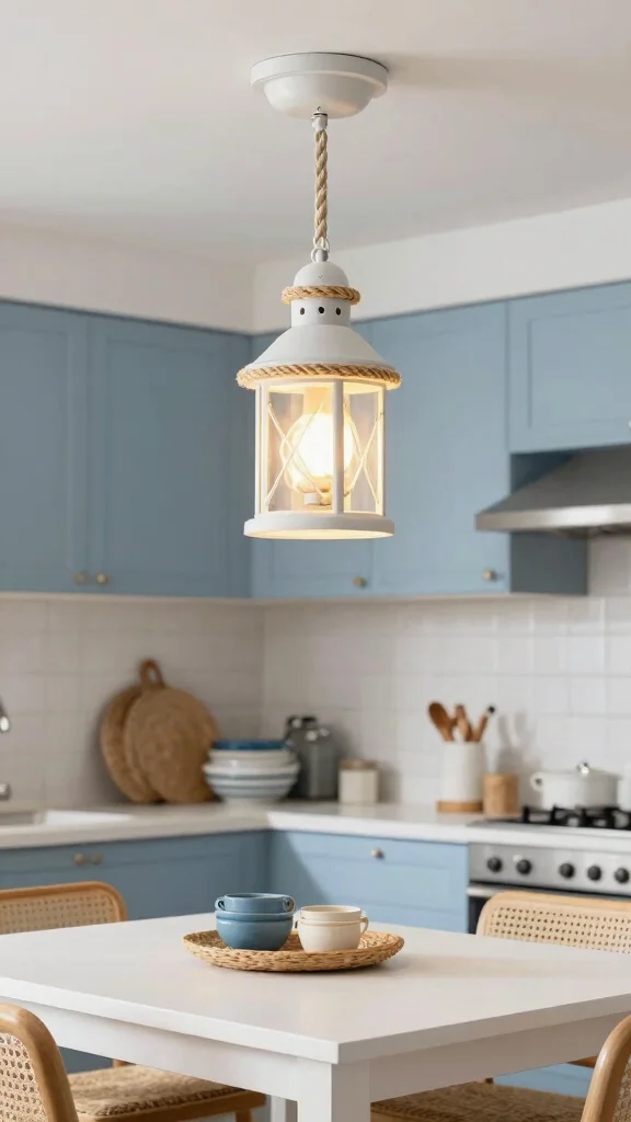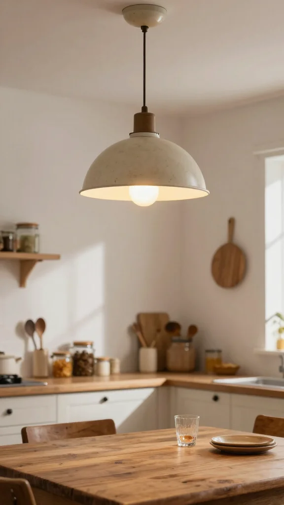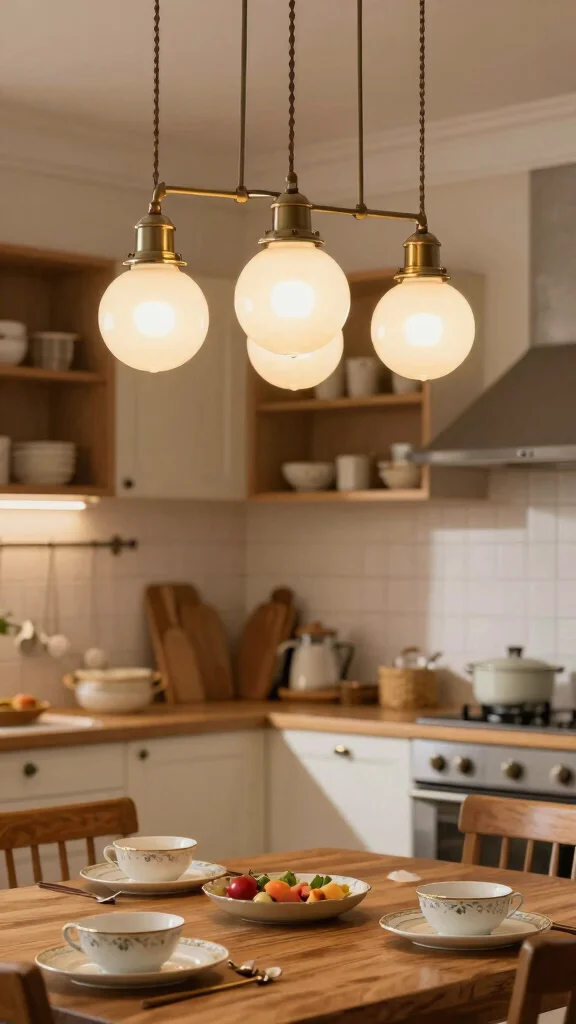 Install these fixtures over key areas like your dining table or kitchen island to create a cozy glow. Opt for soft colors or frosted glass to produce a gentle ambiance that complements various decor styles. Vintage schoolhouse lights can often be found at flea markets, adding unique character to your kitchen.