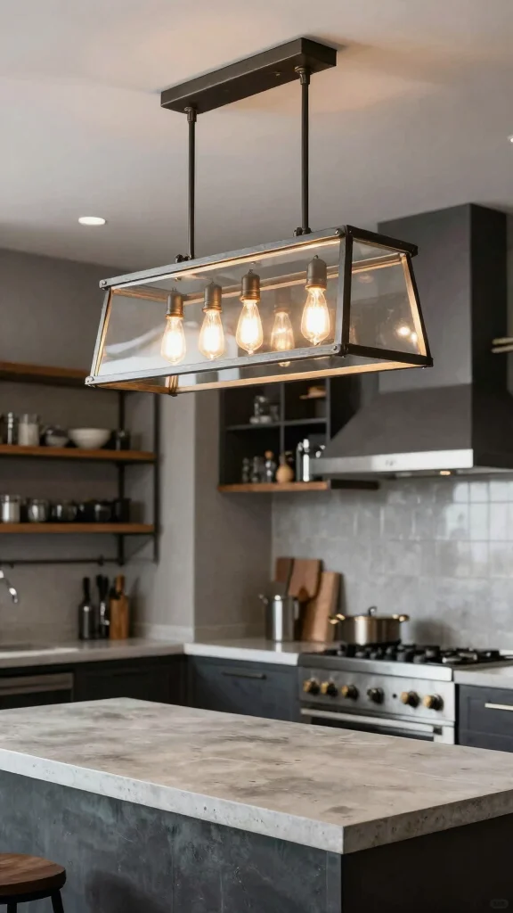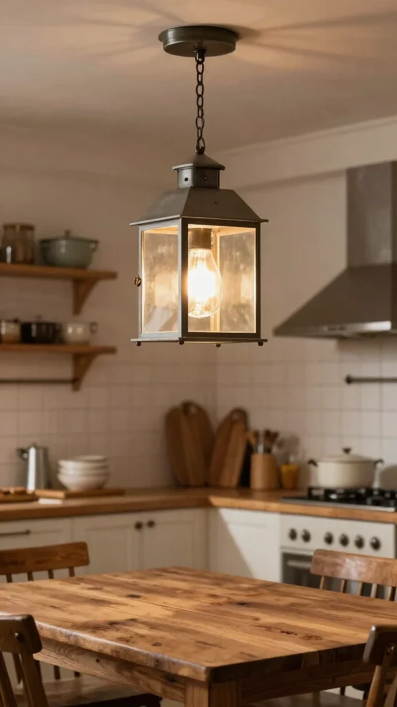 Position a lantern-style fixture above your kitchen table or work area to enhance the rustic vibe. The unique shape draws attention and creates an inviting ambiance that complements your decor. Look for fixtures with decorative details, such as scrollwork or intricate glass patterns, to enrich the overall charm.