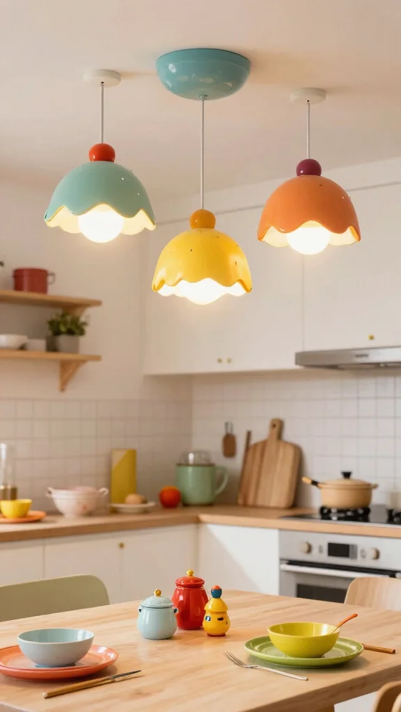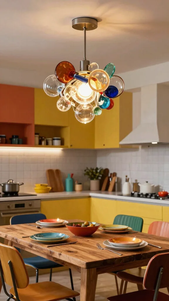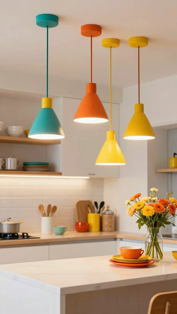 Position these lively lights above your kitchen island or dining area to make them a focal point that attracts attention. Utilizing colorful fixtures alongside neutral cabinetry can create a balanced yet dynamic look. Experimenting with bright colors offers a fun way to refresh your kitchen without the need for extensive renovations.