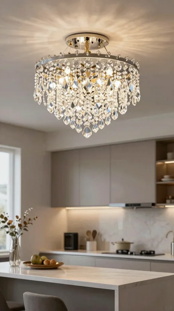Elevate your kitchen with an elegant chandelier flush mount, merging sophistication with practical lighting. Chandeliers add a luxurious touch and can serve as a stunning focal point in your space. With various styles available—from classic crystal designs to sleek modern shapes—they can beautifully complement any decor theme. Picture how a chandelier can transform your kitchen into a refined gathering space.